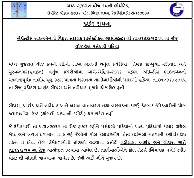 Notification : Madhya Gujarat Vij Company Ltd. (MGVCL) Apprentice Lineman Pole Climbing Test Exam Date 2015 Exam date : 16/03/2015 More Information :
